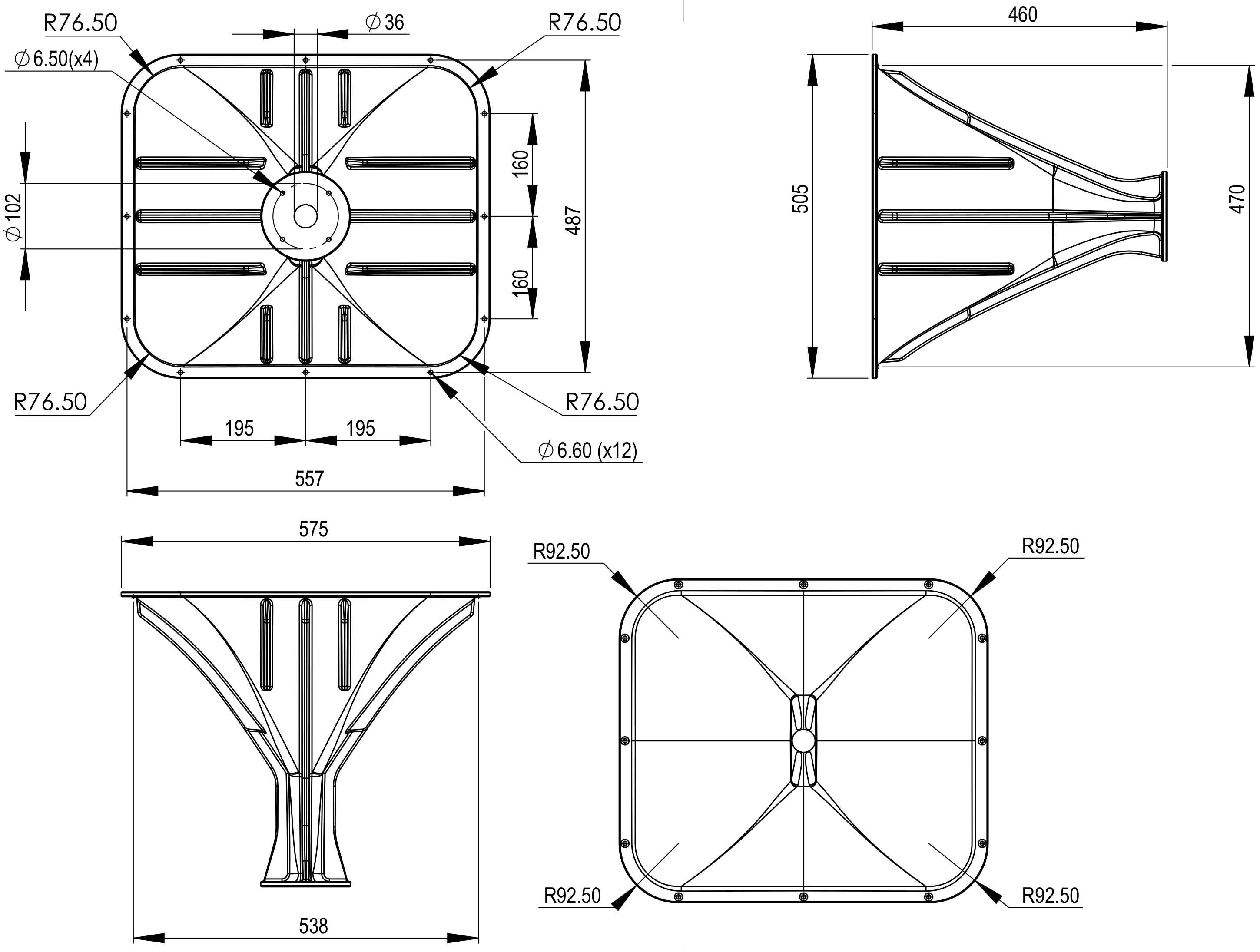 Built to extract the full capabilities of our wide-bandwidth ring radiator drivers, B&C’s new ME464 is the largest commercially available horn for professional audio. The 22” (575mm) wide mouth loads an attached driver to 300Hz, and the 1.4” throat stabilizes a 80° x 60° polar pattern to the upper limit of human hearing. Made of durable and non-resonant polyurethane, the ME464 can stand up to road use as well as shine in high output arrays in fixed installation. Reduced inter-box interaction and off axis energy from the tight pattern brings immediate benefits to sound quality and clarity, and the ME464 is the only horn which can support the full frequency response of our DCX464 coaxial driver. The ME464 can be easily applied to the DCX464 using the FB468 crossover, which is available in 8 or 16 Ohm configurations.