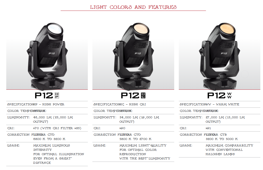 - P12 HC and WW: 1 color wheel with 7 full and half colors + open and linear color selection + CTB filter